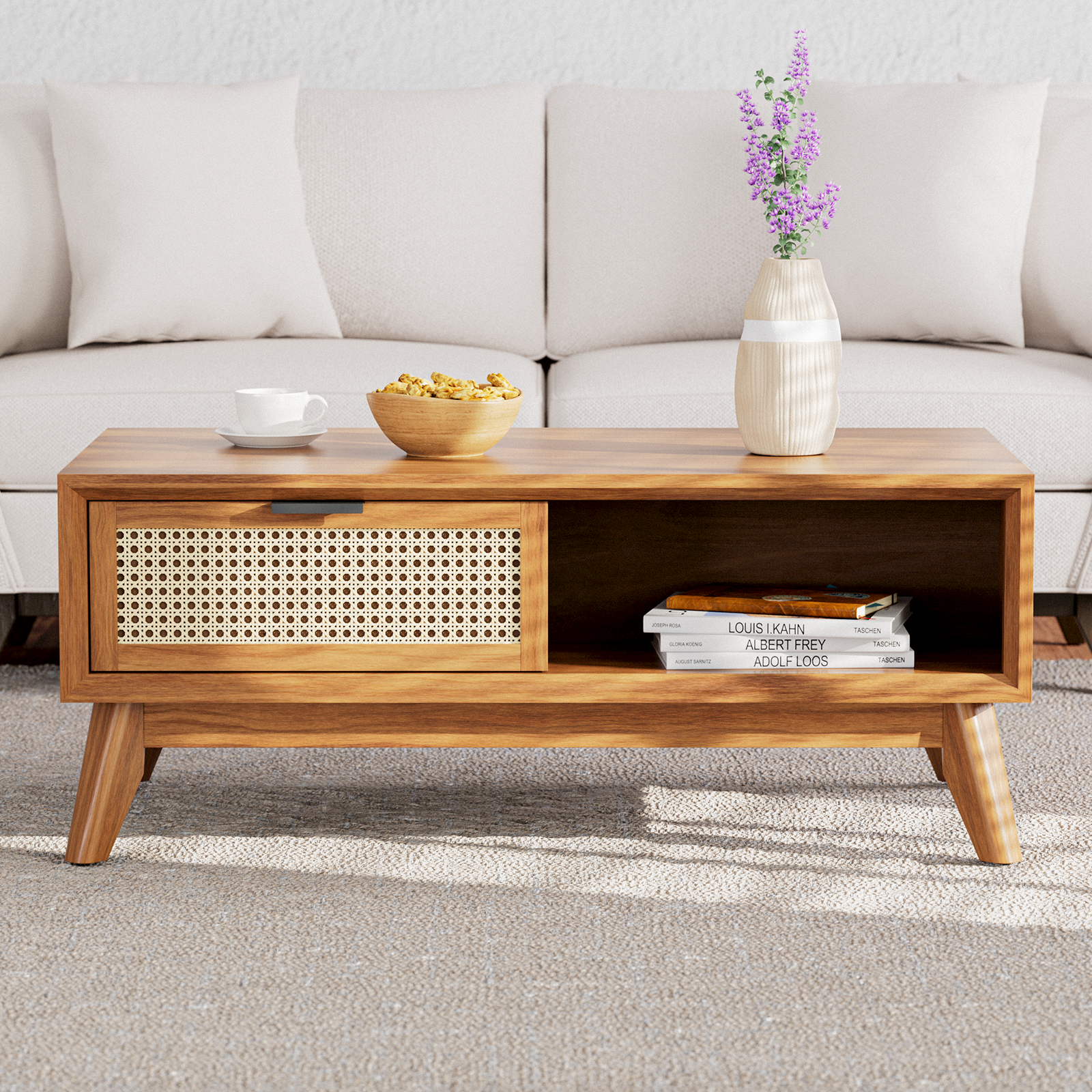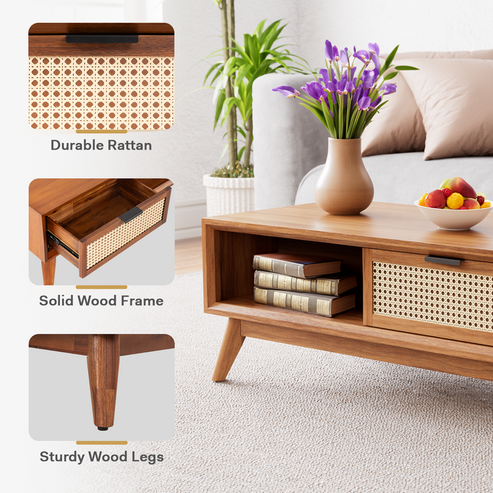 FUNCTIONAL DESIGN: Our coffee table with storage has a smooth, easy-to-clean surface; Solid acacia wood legs with adjustable levelers enhance stability, blending functionality with style.