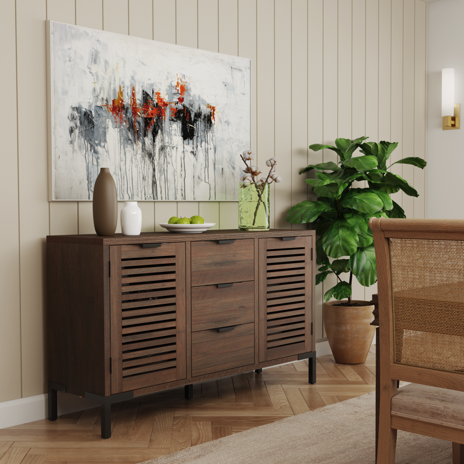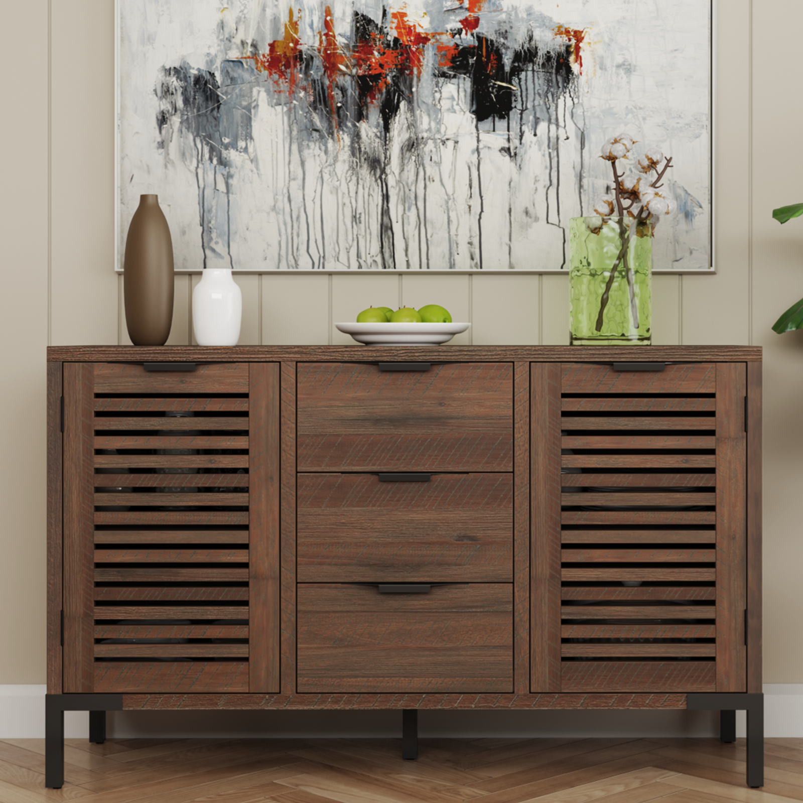 HIGH-QUALITY MATERIAL: Featuring a 100% solid wood frame with a 5-layer chestnut finish and industrial metal accents, this credenza adds a touch of farmhouse style and exceptional durability to your home decor.
