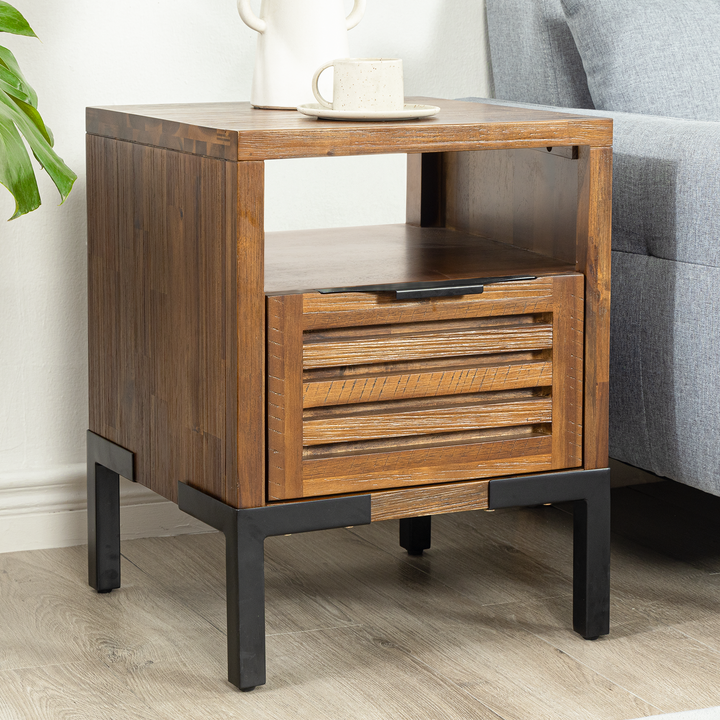 DELUXE NIGHTSTAND WITH DRAWERS: Our 100% solid acacia wood accent nightstand with five layers of coating enhances the beauty & longevity of wood; Supported by robust metal legs & convenient levelers, this rustic side table ensures stability and strength.