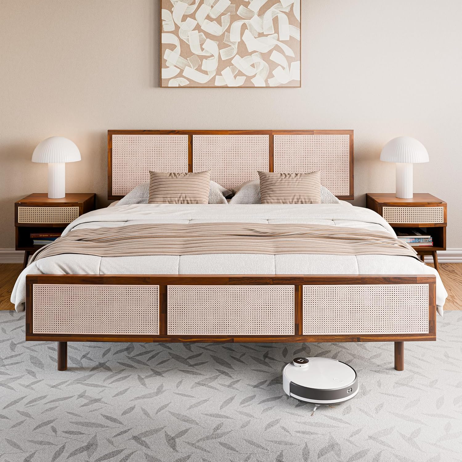 HANDCRAFTED GEOMETRIC PATTERN: Our king bed frame features a striking geometric headboard with inlaid rattan, showcasing a US Patent Pending Design that highlights sustainable wood for a soft, dreamy look.