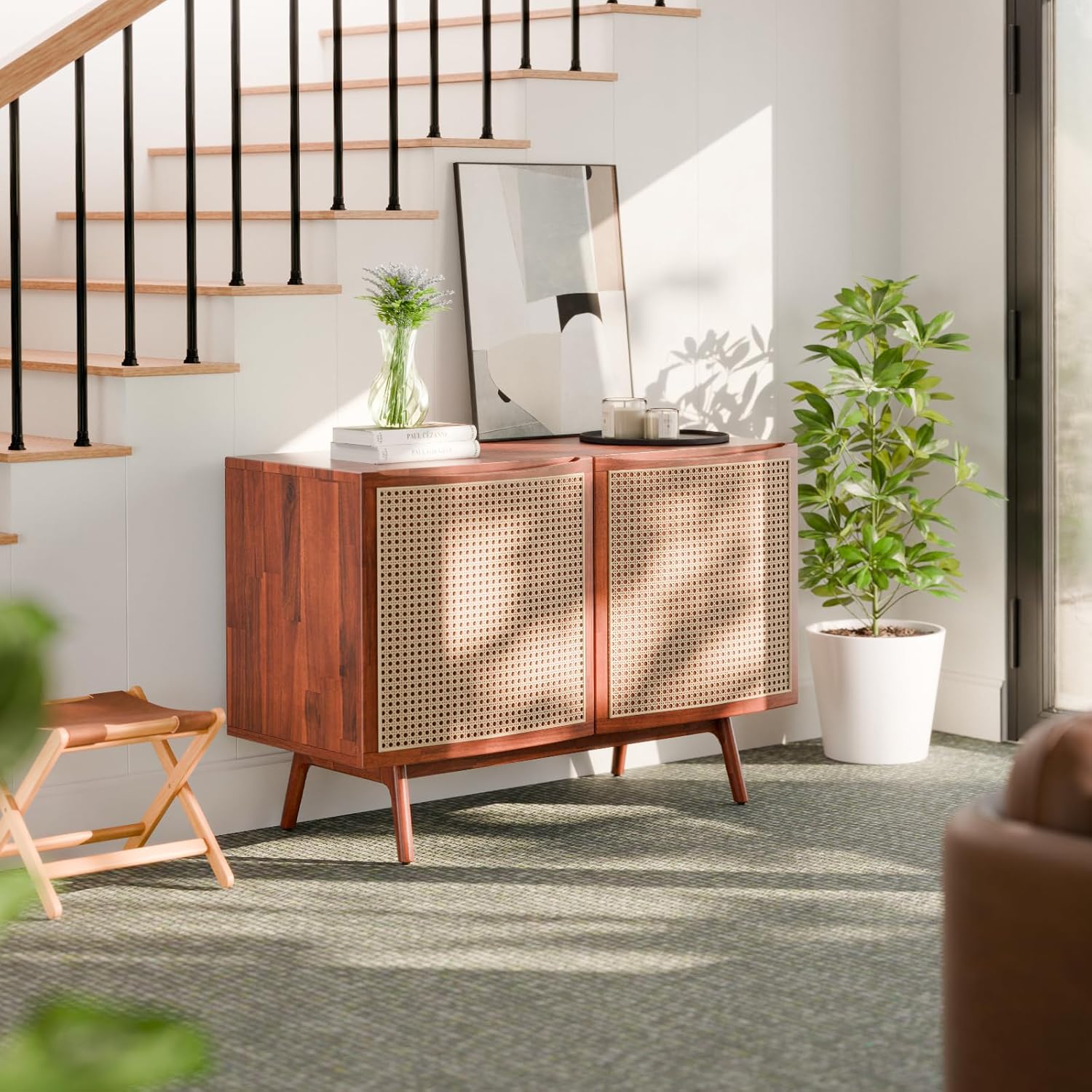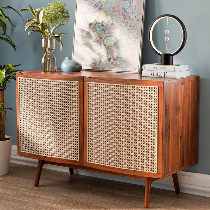 DURABLE MATERIALS: The mid-century cabinet showcases a solid acacia frame, legs, and MDF backboard that exude unparalleled durability; This sideboard is also adorned with plastic rattan to capture both style and functionality.