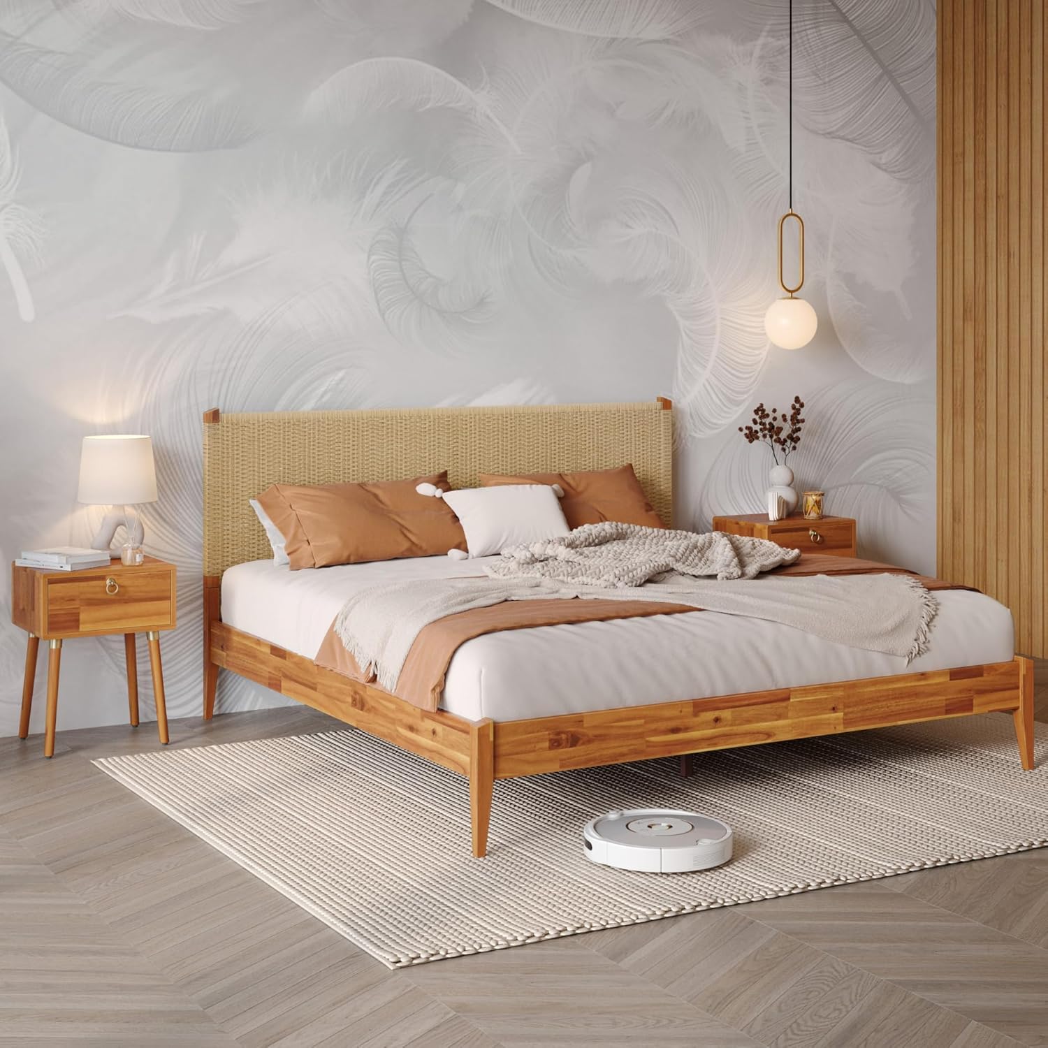 BUILT TO LAST MATERIALS: Our exquisite king bed frame and headboard is crafted from durable solid acacia wood with a special woven headboard design; With its sturdy construction and noiseless design, you can glide effortlessly into your dreamland.
